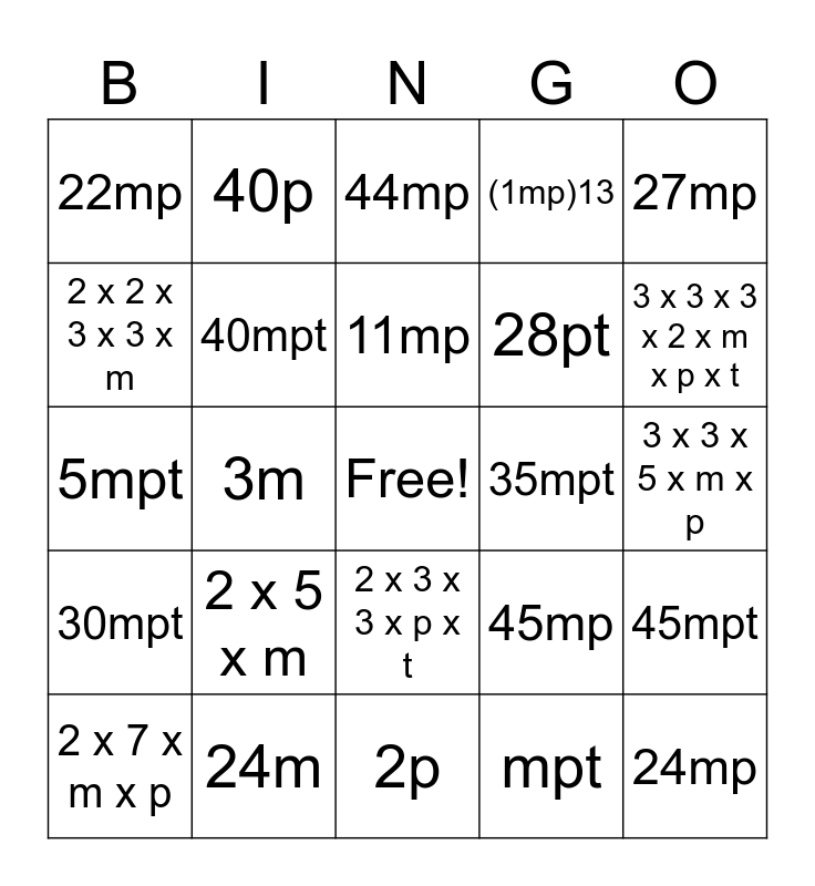 This bingo card has a free space and 24 words: 2 x 5 x m, 24m, 11mp, 2 x 7 x m x p, 27mp, 22mp, 2 x 2 x 3 x 3 x m, 40p, 35mpt, 2 x 3 x 3 x p x t, 28pt, 5mpt, 45mp, 45mpt, 40mpt, mpt, 3 x 3 x 5 x m x p, 44mp, 3 x 3 x 3 x 2 x m x p x t, 3m, 24mp, 30mpt, (1mp)13 and 2p.