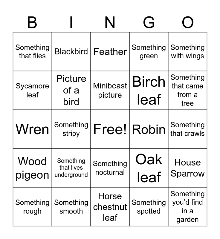 This bingo card has a free space and 27 words: Oak leaf, Maple leaf, Birch leaf, Horse chestnut leaf, Sycamore leaf, Feather, Blackbird, Wood pigeon, Robin, House Sparrow, Wren, Something green, Something rough, Something smooth, Something that came from a tree, Picture of an animal, Picture of a bird, Minibeast picture, Something that lives underground, Something that flies, Something that crawls, Something spotted, Something stripy, Something you’d find in a garden, Something nocturnal, Something with wings and Something you’d hear before you see.