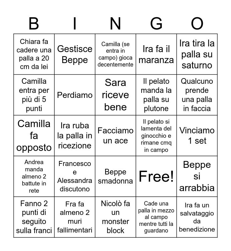 This bingo card has 25 words: Francesco e Alessandra discutono, Nicolò fa un monster block, Sara riceve bene, Fanno 2 punti di seguito sulla franci, Ira tira la palla su saturno, Chiara fa cadere una palla a 20 cm da lei, Camilla entra per più di 5 punti, Gestisce Beppe, Il pelato si lamenta del ginocchio e rimane cmq in campo, Beppe smadonna, Il pelato manda la palla su plutone, Camilla fa opposto, Free!, Beppe si arrabbia, Perdiamo, Ira fa un salvataggio da benedizione, Vinciamo 1 set, Camilla (se entra in campo) gioca decentemente, Qualcuno prende una palla in faccia, Ira ruba la palla in ricezione, Facciamo un ace, Fra fa almeno 2 muri fallimentari, Andrea manda almeno 2 battute in rete, Ira fa il maranza and Cade una palla in mezzo al campo mentre tutti la guardano.