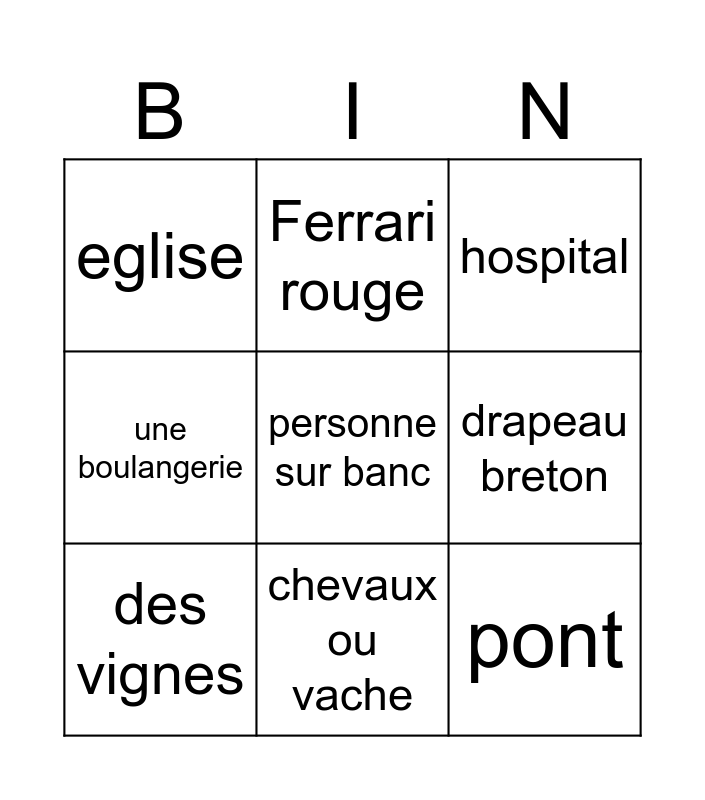 This bingo card has a free space and 8 words: drapeau breton, hospital, Ferrari rouge, des vignes, eglise, pont, une boulangerie and chevaux ou vache.