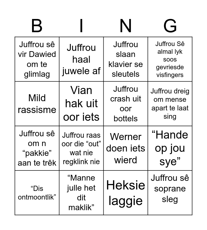 This bingo card has 21 words: “Manne julle het dit maklik”, Juffrou sê tenore sing fals, Juffrou haal juwele af, Juffrou blaas die fluit, Heksie laggie, Juffrou crash uit oor bottels, Juffrou sê vir Dawied om te glimlag, Juffrou slaan klavier se sleutels, Werner doen iets wierd, Juffrou dreig om mense apart te laat sing, Juffrou sê om n “pakkie” aan te trêk, Juffrou Sê almal lyk soos gevriesde visfingers, Juffrou sê soprane sleg, Juffrou raas met De Wet, Vian hak uit oor iets, Juffrou sê vir ons om brits te sing, “Dis ontmoontlik”, Juffrou raas oor die “out” wat nie regklink nie, Mild rassisme, “Hande op jou sye” and Juffrou sê vir basse sleg.