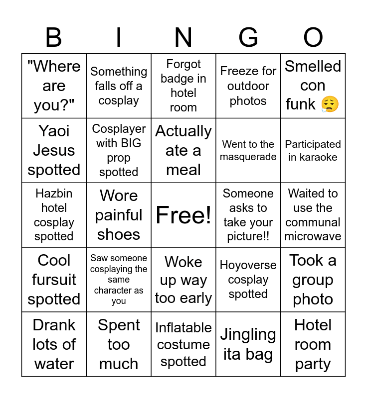 This bingo card has a free space and 24 words: Saw someone cosplaying the same character as you, Spent too much, Actually ate a meal, Drank lots of water, Smelled con funk 😮💨, "Where are you?", Yaoi Jesus spotted, Something falls off a cosplay, Someone asks to take your picture!!, Woke up way too early, Went to the masquerade, Hazbin hotel cosplay spotted, Hoyoverse cosplay spotted, Took a group photo, Cosplayer with BIG prop spotted, Jingling ita bag, Waited to use the communal microwave, Forgot badge in hotel room, Participated in karaoke, Wore painful shoes, Hotel room party, Cool fursuit spotted, Freeze for outdoor photos and Inflatable costume spotted.