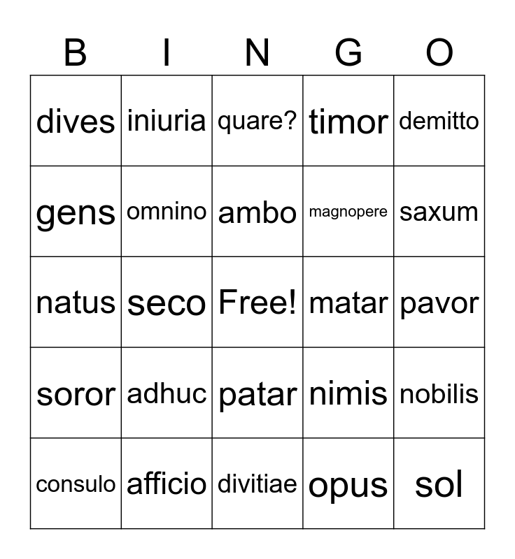 This bingo card has a free space and 24 words: adhuc, afficio, ambo, consulo, demitto, dives, gens, iniuria, matar, patar, magnopere, natus, nimis, nobilis, omnino, opus, pavor, quare?, saxum, seco, sol, soror, timor and divitiae.