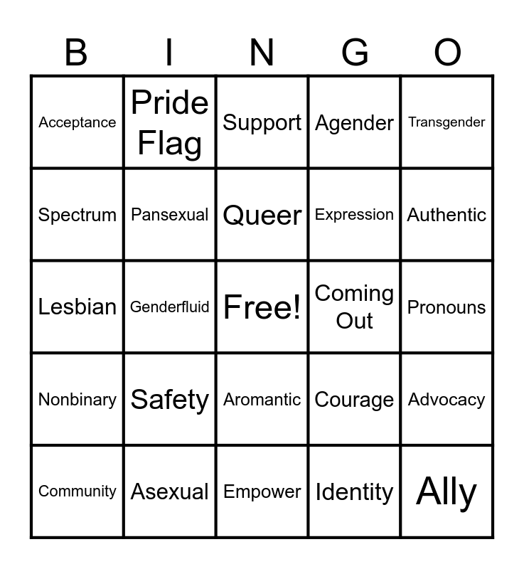 This bingo card has a free space and 40 words: Gay, Lesbian, Bisexual, Pansexual, Asexual, Aromantic, Queer, Questioning, Transgender, Nonbinary, Genderfluid, Agender, Ally, Pronouns, Coming Out, Safety, Chosen Family, Acceptance, Respect, Support, Advocacy, Identity, Expression, Spectrum, Transition, Inclusivity, Equality, Representation, Rainbow, Stonewall, Unity, Community, Belonging, Courage, Authentic, Empower, Celebrate, Safe Space, Pride Flag and Friendship.