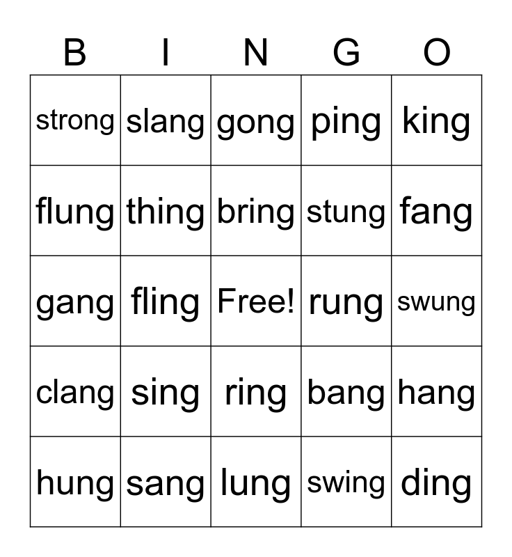 This bingo card has a free space and 24 words: sing, sang, bring, hung, king, strong, flung, slang, rung, ring, stung, gang, bang, hang, thing, swing, swung, gong, fang, fling, ding, clang, ping and lung.
