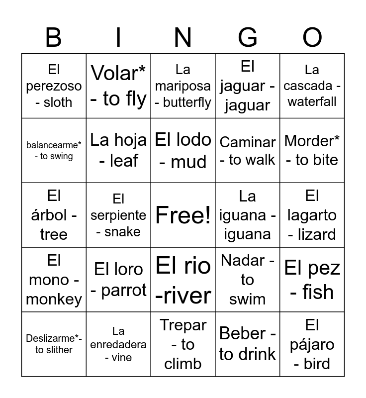 This bingo card has a free space and 41 words: La selva tropical - tropical rainforest, El árbol - tree, La flor - flower, La hoja - leaf, La enredadera - vine, El rio -river, El lodo - mud, La piedra - rock, La cascada - waterfall, El mono - monkey, El serpiente - snake, El jaguar - jaguar, El pájaro - bird, El lagarto - lizard, La iguana - iguana, El loro - parrot, La rana - frog, El perezoso - sloth, El insecto - insect, La mariposa - butterfly, El pez - fish, El mosquito - mosquito, Trepar - to climb, Caminar - to walk, Correr - to run, Comer - to eat, Beber - to drink, Tomar - to drink/take, Morder* - to bite, Picar - to sting/bite (bugs), Saltar - to jump, Volar* - to fly, Deslizarme*- to slither, Caerme* - to fall, Nadar - to swim, balancearme* - to swing, Peligroso - dangerous, Venenosa - poisonous/venomous, Grande - big, Pequeño - small and Colorido - colorful.