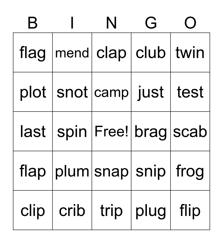 This bingo card has a free space and 24 words: clip, plum, camp, plug, twin, flag, mend, clap, brag, scab, last, snot, snip, frog, plot, crib, trip, club, test, flap, spin, snap, just and flip.
