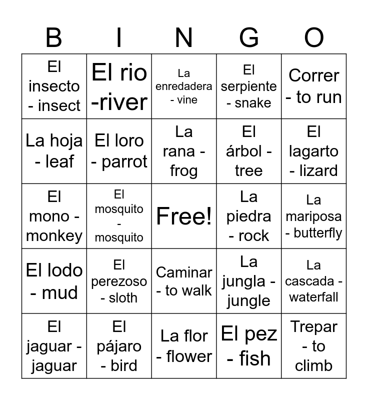 This bingo card has a free space and 27 words: La jungla - jungle, La selva tropical - tropical rainforest, El árbol - tree, La flor - flower, La hoja - leaf, La enredadera - vine, El rio -river, El lodo - mud, La piedra - rock, La cascada - waterfall, El mono - monkey, El serpiente - snake, El jaguar - jaguar, El pájaro - bird, El lagarto - lizard, La iguana - iguana, El loro - parrot, La rana - frog, El perezoso - sloth, El insecto - insect, La mariposa - butterfly, El pez - fish, El mosquito - mosquito, Trepar - to climb, Caminar - to walk, Correr - to run and Comer - to eat.