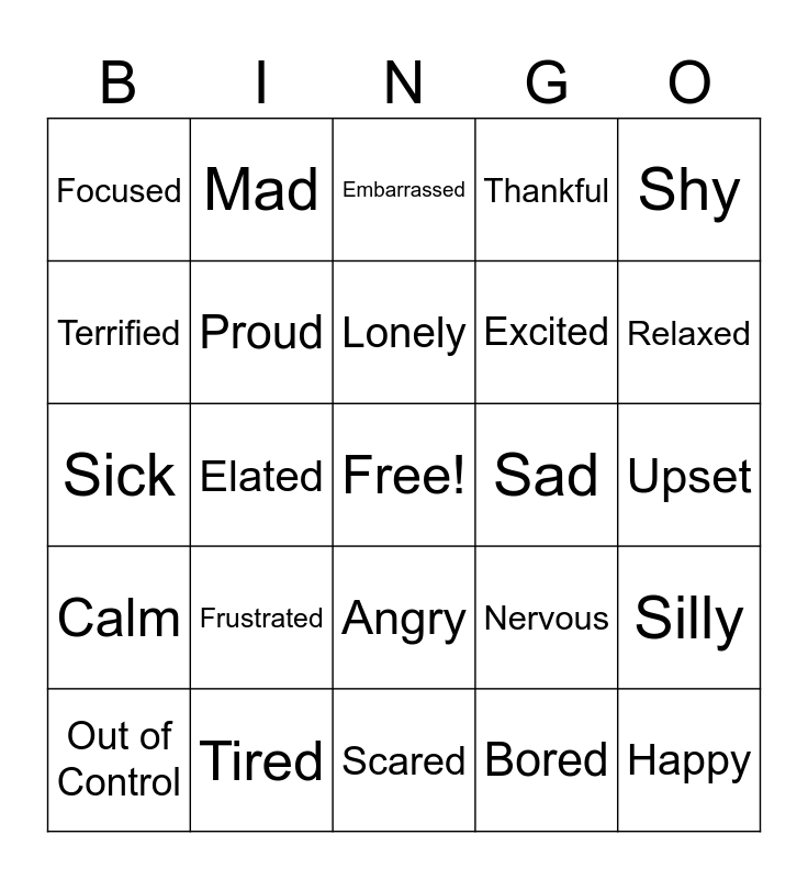 This bingo card has a free space and 24 words: Frustrated, Tired, Lonely, Out of Control, Shy, Focused, Terrified, Mad, Sad, Angry, Excited, Sick, Nervous, Silly, Proud, Bored, Upset, Embarrassed, Relaxed, Elated, Happy, Calm, Thankful and Scared.