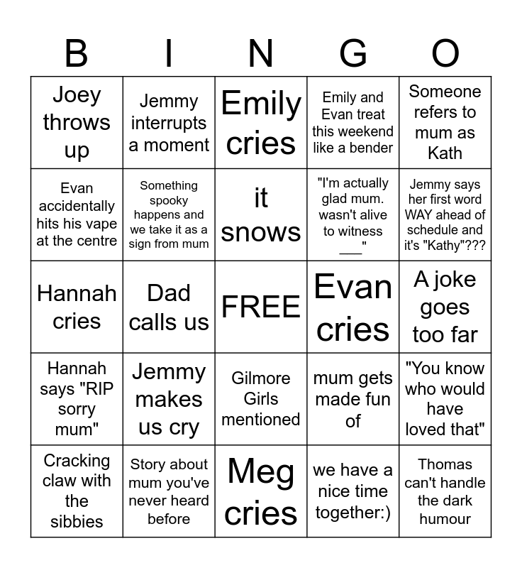This bingo card has a free space and 24 words: Jemmy makes us cry, Story about mum you've never heard before, it snows, Cracking claw with the sibbies, Someone refers to mum as Kath, Joey throws up, Evan accidentally hits his vape at the centre, Jemmy interrupts a moment, Evan cries, Gilmore Girls mentioned, "I'm actually glad mum. wasn't alive to witness ___", Hannah cries, mum gets made fun of, "You know who would have loved that", Something spooky happens and we take it as a sign from mum, we have a nice time together:), A joke goes too far, Emily cries, Jemmy says her first word WAY ahead of schedule and it's "Kathy"???, Dad calls us, Thomas can't handle the dark humour, Hannah says "RIP sorry mum", Emily and Evan treat this weekend like a bender and Meg cries.