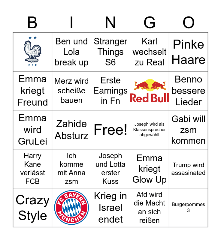 This bingo card has 3 images, a free space and 21 words: Ich komme mit Anna zsm, Erste Earnings in Fn, Crazy Style, Pinke Haare, Emma kriegt Freund, Ben und Lola break up, Joseph wird als Klassensprecher abgewählt, Joseph und Lotta erster Kuss, Emma wird GruLei, Emma kriegt Glow Up, Trump wird assasinated, Merz wird scheiße bauen, Afd wird die Macht an sich reißen, Gabi will zsm kommen, Stranger Things S6, Benno bessere Lieder, Zahide Absturz, Burgerpommes 3, Harry Kane verlässt FCB, Karl wechselt zu Real and Krieg in Israel endet.