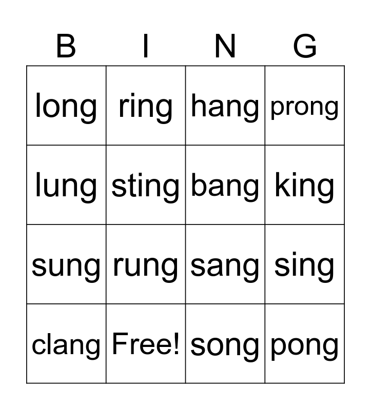 This bingo card has 16 words: Free!, sing, hang, long, sung, ring, sang, song, lung, sting, clang, prong, rung, king, bang and pong.