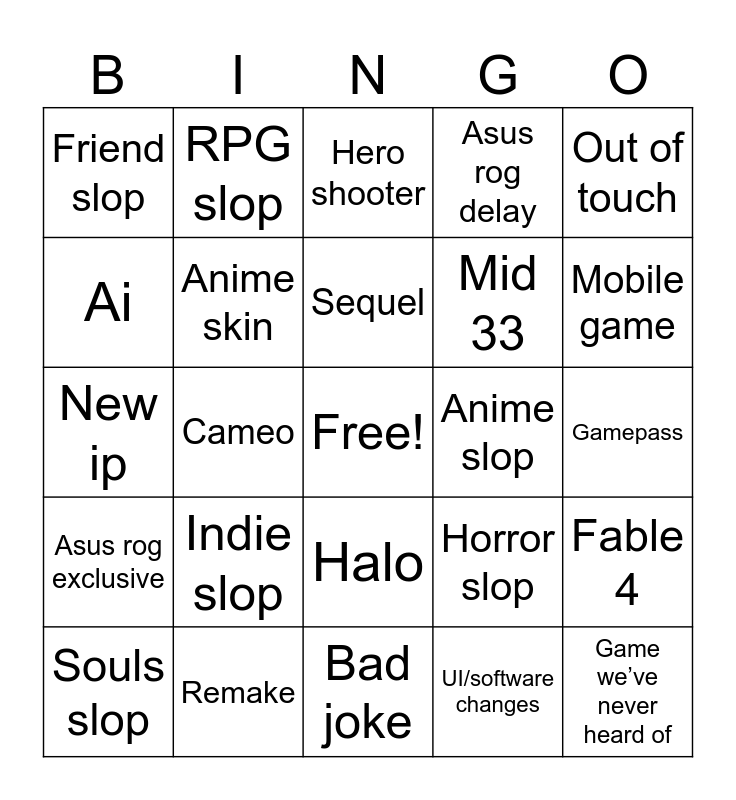 This bingo card has a free space and 24 words: Indie slop, Remake, Sequel, Souls slop, Out of touch, Friend slop, Ai, RPG slop, Anime slop, Halo, Mid 33, New ip, Horror slop, Fable 4, Anime skin, UI/software changes, Gamepass, Hero shooter, Mobile game, Cameo, Game we’ve never heard of, Asus rog exclusive, Asus rog delay and Bad joke.