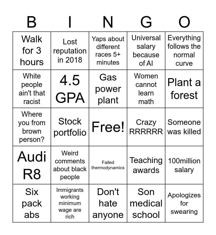 This bingo card has a free space and 24 words: Weird comments about black people, Immigrants working minimum wage are rich, Gas power plant, Six pack abs, Everything follows the normal curve, Walk for 3 hours, White people ain't that racist, Lost reputation in 2018, Crazy RRRRRR, Failed thermodynamics, Women cannot learn math, Where you from brown person?, Teaching awards, 100million salary, 4.5 GPA, Son medical school, Someone was killed, Yaps about different races 5+ minutes, Plant a forest, Stock portfolio, Apologizes for swearing, Audi R8, Universal salary because of AI and Don't hate anyone.