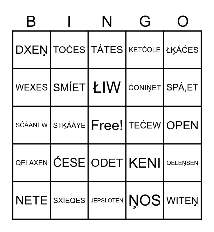 This bingo card has a free space and 24 words: NETE, ĆESE, ŁIW, ŅOS, ŁĶÁĆES, DXEŅ, TOĆES, TÁTES, TEĆEW, OPEN, SĆÁÁNEW, SMÍET, KENI, QELEŅSEN, WEXES, SXÍEQES, JEPSI,OTEN, KETĆOLE, SPÁ,ET, QELAXEN, STĶÁÁYE, ODET, ĆONIŅET and WITEŅ.