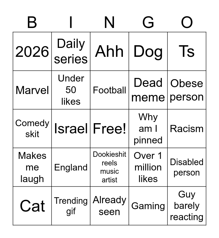 This bingo card has a free space and 24 words: Cat, England, Football, Gaming, Ts, 2026, Daily series, Ahh, Why am I pinned, Racism, Comedy skit, Under 50 likes, Over 1 million likes, Disabled person, Marvel, Trending gif, Already seen, Dog, Obese person, Makes me laugh, Israel, Dookieshit reels music artist, Dead meme and Guy barely reacting.