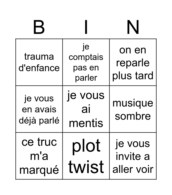 This bingo card has a free space and 8 words: musique sombre, on en reparle plus tard, je comptais pas en parler, ce truc m'a marqué, trauma d'enfance, je vous invite a aller voir, je vous en avais déjà parlé and plot twist.