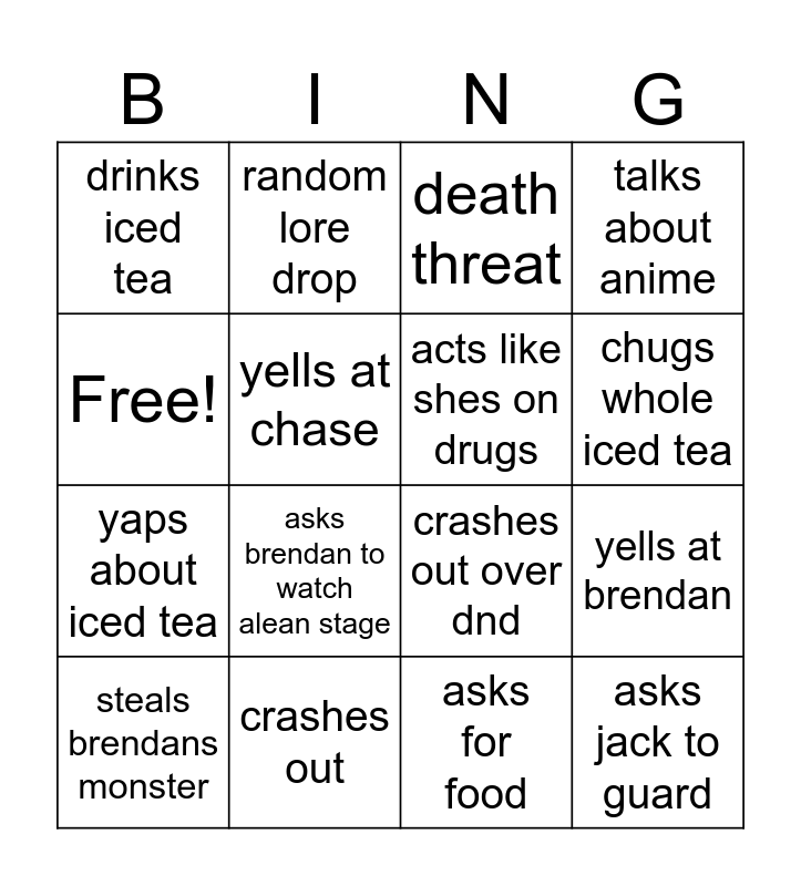 This bingo card has 16 words: crashes out, yells at brendan, death threat, drinks iced tea, yaps about iced tea, random lore drop, crashes out over dnd, asks for food, Free!, yells at chase, steals brendans monster, talks about anime, asks brendan to watch alean stage, chugs whole iced tea, acts like shes on drugs and asks jack to guard.