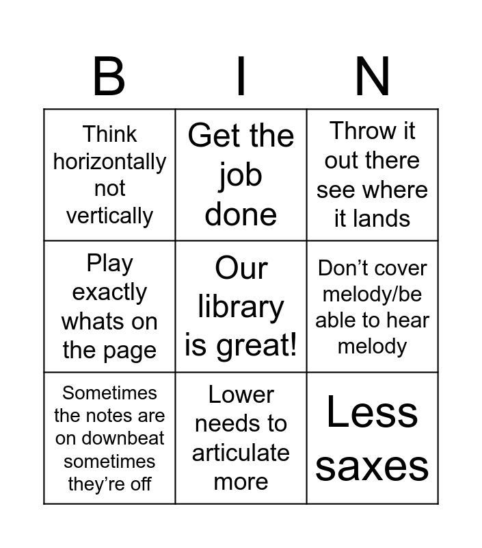 This bingo card has 48 words: More air, Proud of band sound, More trombone/less trumpet, Big interval big music, Don’t churn butter but move, Nobody ever plays this, Get the job done, Don’t need help to be heard, Don’t cover melody/be able to hear melody, Stupid band articulations e.g. “yup”, Sometimes the notes are on downbeat sometimes they’re off, Play exactly whats on the page, Individually responsible for the time, Now for something completely different, Start crescendos quieter, Word “in-tone-ation”, Lower needs to articulate more, Thats a huge flex/bougie, Toe on nasty, Our library is great!, Percussion SHUT UP!!, It’s not like this everywhere, Think horizontally not vertically, Less saxes, 1 2 you know what to do, I got this from a clinic, Nick be more musical/tasteful, I’ve been seeing X practice/in tutorial, More clarinets, Horns *gorilla action*, Anecdote, Fill up the room, Air on release, Play to exit sign, Best band room in the state, Piccolo have no fear or else…, Thanks for waiting, No pear shaped notes, A lot of ink on the page, When north shows up theres an expectation, Chasing after notes, *calls wrong rehearsal/letter*, Throw it out there see where it lands, Dr may is the smartest person i know, Secret sauce is in the kids, Drummer is driving the bus, Accent after eighth rest and Take a few seconds to look at X.