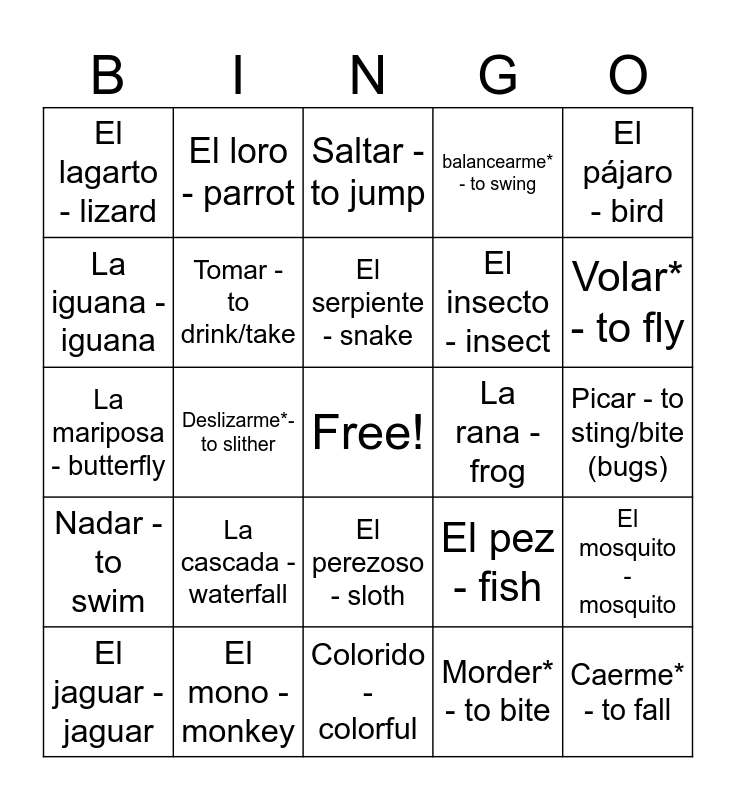 This bingo card has a free space and 24 words: La cascada - waterfall, El mono - monkey, El serpiente - snake, El jaguar - jaguar, El pájaro - bird, El lagarto - lizard, La iguana - iguana, El loro - parrot, La rana - frog, El perezoso - sloth, El insecto - insect, La mariposa - butterfly, El pez - fish, El mosquito - mosquito, Tomar - to drink/take, Morder* - to bite, Picar - to sting/bite (bugs), Saltar - to jump, Volar* - to fly, Deslizarme*- to slither, Caerme* - to fall, Nadar - to swim, balancearme* - to swing and Colorido - colorful.