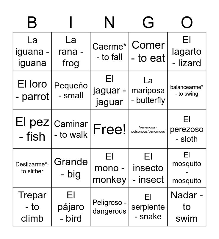 This bingo card has a free space and 26 words: El mono - monkey, El serpiente - snake, El jaguar - jaguar, El pájaro - bird, El lagarto - lizard, La iguana - iguana, El loro - parrot, La rana - frog, El perezoso - sloth, El insecto - insect, La mariposa - butterfly, El pez - fish, El mosquito - mosquito, Trepar - to climb, Caminar - to walk, Correr - to run, Comer - to eat, Deslizarme*- to slither, Caerme* - to fall, Nadar - to swim, balancearme* - to swing, Peligroso - dangerous, Venenosa - poisonous/venomous, Grande - big, Pequeño - small and Colorido - colorful.