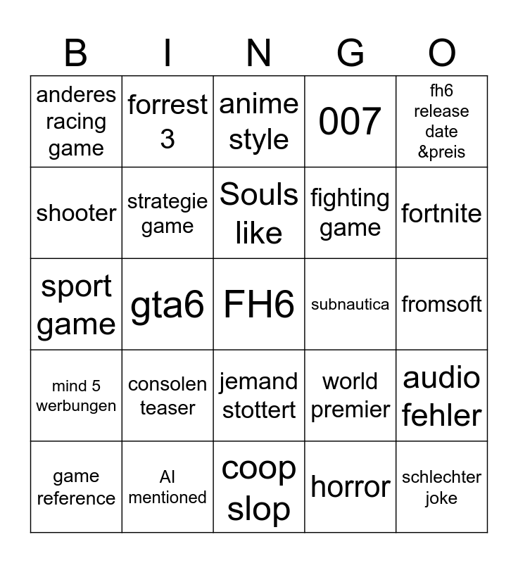 This bingo card has a free space and 24 words: consolen teaser, AI mentioned, Souls like, game reference, fh6 release date &preis, anderes racing game, shooter, forrest 3, subnautica, jemand stottert, fighting game, sport game, world premier, audio fehler, strategie game, horror, fromsoft, anime style, fortnite, gta6, schlechter joke, mind 5 werbungen, 007 and coop slop.