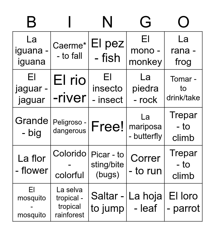This bingo card has a free space and 61 words: La jungla - jungle, La selva tropical - tropical rainforest, El árbol - tree, La flor - flower, La hoja - leaf, La enredadera - vine, El rio -river, El lodo - mud, La piedra - rock, La cascada - waterfall, El mono - monkey, El serpiente - snake, El jaguar - jaguar, El pájaro - bird, El lagarto - lizard, La iguana - iguana, El loro - parrot, La rana - frog, El perezoso - sloth, El insecto - insect, La mariposa - butterfly, El pez - fish, El mosquito - mosquito, Trepar - to climb, Caminar - to walk, Correr - to run, Comer - to eat, Beber - to drink, Tomar - to drink/take, Morder* - to bite, Picar - to sting/bite (bugs), Saltar - to jump, Volar* - to fly, Deslizarme*- to slither, Caerme* - to fall, Nadar - to swim, balancearme* - to swing, Peligroso - dangerous, Venenosa - poisonous/venomous, Grande - big, Pequeño - small, Colorido - colorful, Trepar - to climb, Caminar - to walk, Correr - to run, Comer - to eat, Beber - to drink, Tomar - to drink/take, Morder* - to bite, Picar - to sting/bite (bugs), Saltar - to jump, Volar* - to fly, Deslizarme*- to slither, Caerme* - to fall, Nadar - to swim, balancearme* - to swing, Peligroso - dangerous, Venenosa - poisonous/venomous, Grande - big, Pequeño - small and Colorido - colorful.