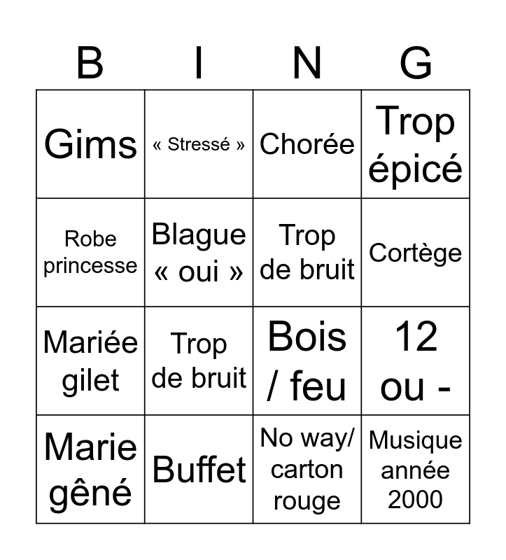 This bingo card has 16 words: Buffet, 12 ou -, Chorée, Gims, Mariée gilet, « Stressé », Bois / feu, No way/ carton rouge, Robe princesse, Blague « oui », Marie gêné, Trop épicé, Trop de bruit, Cortège, Trop de bruit and Musique année 2000.