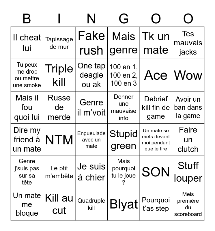 This bingo card has 36 words: Mais pourquoi tu le joue ?, Je suis à chier, Blyat, Tu peux me drop ou mettre une smoke, Dire my friend à un mate, Donner une mauvaise info, Triple kill, Quadruple kill, Tk un mate, SON, Wow, Mais genre, Stuff louper, Russe de merde, 100 en 1, 100 en 2, 100 en 3, Il cheat lui, Genre j’suis pas sur sa tête, Debrief kill fin de game, Mais il fou quoi lui, Fake rush, Genre il m’voit, NTM, Stupid green, Engueulade avec un mate, Un mate se mets devant moi pendant que je tire, Tapissage de mur, Ace, Kill au cut, One tap deagle ou ak, Tes mauvais jacks, Meis première du scoreboard, Un mate me bloque, Faire un clutch, Avoir un ban dans la game, Le ptit m’embête and Pourquoi t’as step.