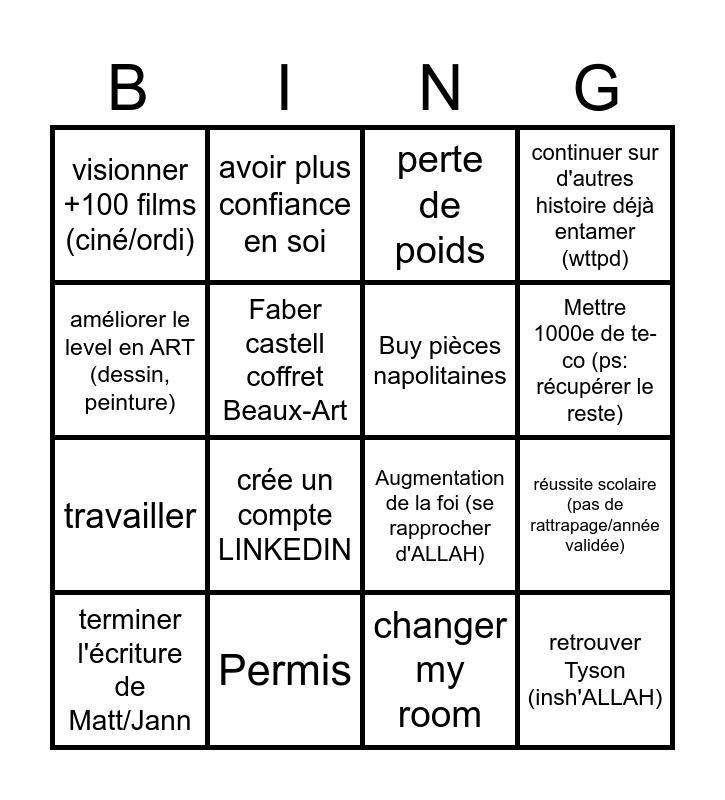 This bingo card has 16 words: Permis, réussite scolaire (pas de rattrapage/année validée), perte de poids, visionner +100 films (ciné/ordi), travailler, avoir plus confiance en soi, Augmentation de la foi (se rapprocher d'ALLAH), changer my room, améliorer le level en ART (dessin, peinture), Faber castell coffret Beaux-Art, terminer l'écriture de Matt/Jann, continuer sur d'autres histoire déjà entamer (wttpd), crée un compte LINKEDIN, Mettre 1000e de te-co (ps: récupérer le reste), Buy pièces napolitaines and retrouver Tyson (insh'ALLAH).