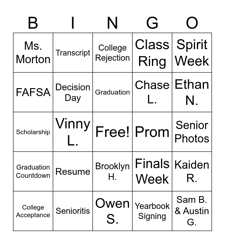 This bingo card has a free space and 30 words: Senioritis, Cap & Gown, Vinny L., Senior Skip Day, Ms. Morton, College Rejection, Decision Day, Brooklyn H., Prom, Owen S., Senior Photos, Sam B. & Austin G., Yearbook Signing, Senior Prank, Ethan N., Gap Year, Finals Week, Graduation Countdown, Resume, Spirit Week, Scholarship, Shaine W., Transcript, Chase L., FAFSA, Class Ring, Kaiden R., College Acceptance, Graduation and Student Loans.