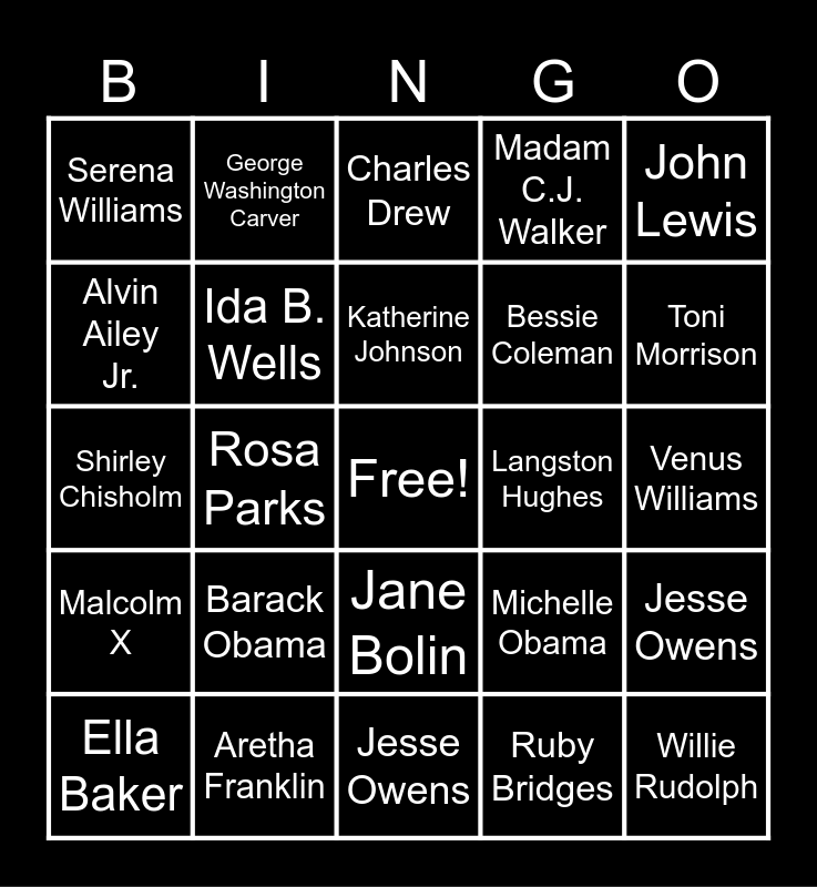 This bingo card has a free space and 33 words: Mike Brown Jr., Martin Luther King Jr., Rosa Parks, Harriet Tubman, Malcolm X, Ida B. Wells, John Lewis, Ella Baker, George Washington Carver, Mae C. Jemison, Katherine Johnson, Charles Drew, Patricia Bath, Maya Angelou, Langston Hughes, Toni Morrison, Aretha Franklin, Shirley Chisholm, Barack Obama, Michelle Obama, Jane Bolin, Jackie Robinson, Serena Williams, Venus Williams, Jesse Owens, Willie Rudolph, Madam C.J. Walker, Bessie Coleman, Alvin Ailey Jr., Jesse Owens, Emmit Till, Ruby Bridges and Henrietta Lacks.