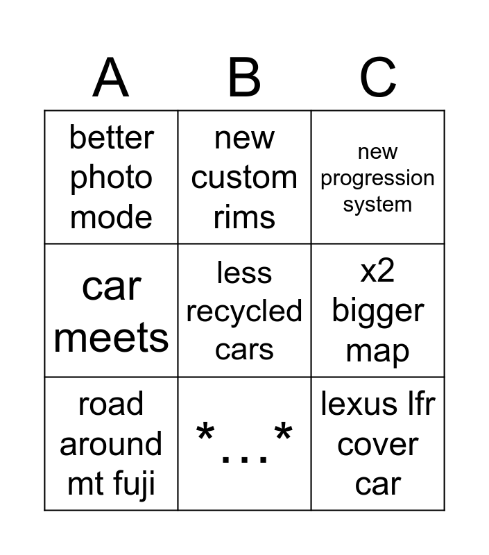 This bingo card has a free space and 8 words: x2 bigger map, new progression system, new custom rims, road around mt fuji, better photo mode, lexus lfr cover car, car meets and *…*.