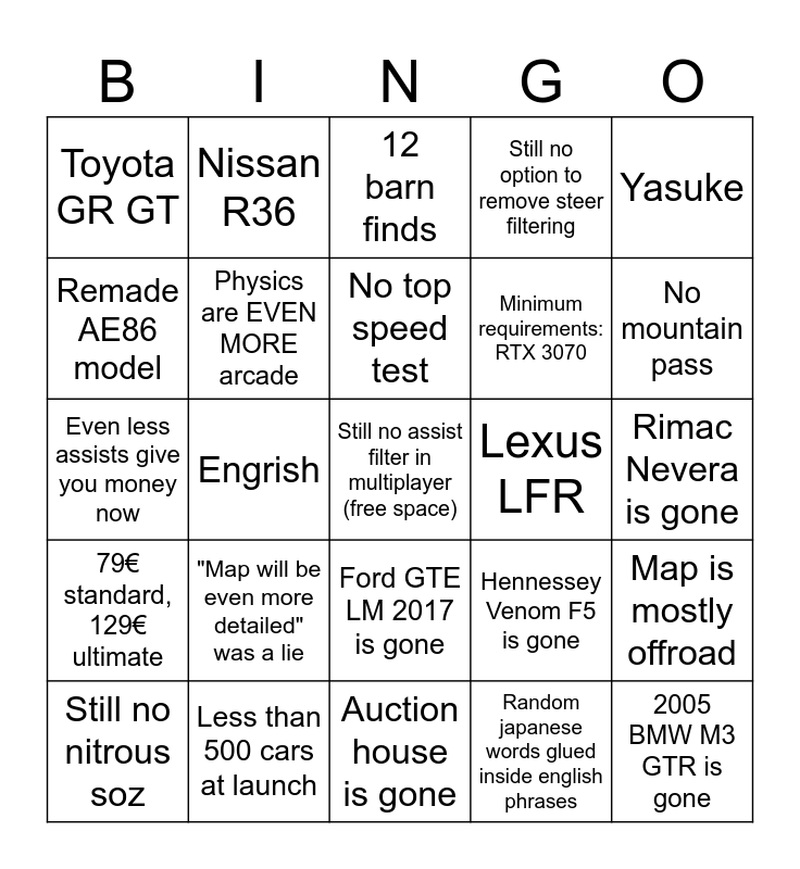 This bingo card has a free space and 24 words: "Map will be even more detailed" was a lie, Less than 500 cars at launch, No top speed test, Still no nitrous soz, Yasuke, Toyota GR GT, Remade AE86 model, Nissan R36, Lexus LFR, Ford GTE LM 2017 is gone, Minimum requirements: RTX 3070, Even less assists give you money now, Hennessey Venom F5 is gone, Map is mostly offroad, Physics are EVEN MORE arcade, Random japanese words glued inside english phrases, Rimac Nevera is gone, 12 barn finds, No mountain pass, Engrish, 2005 BMW M3 GTR is gone, 79€ standard, 129€ ultimate, Still no option to remove steer filtering and Auction house is gone.