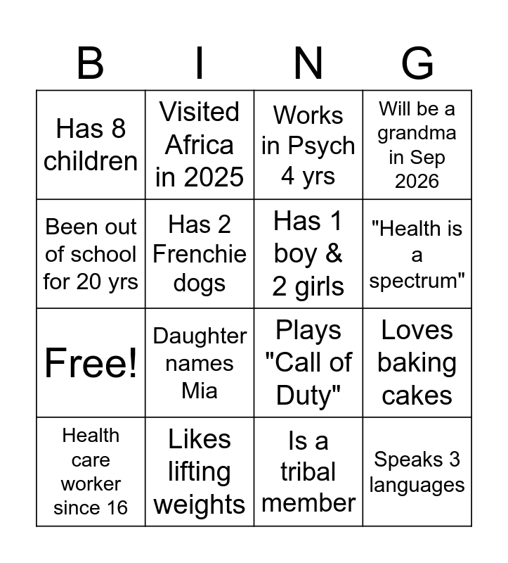 This bingo card has 20 words: Loves baking cakes, Has an Axolotl, Works in Psych 4 yrs, Has a Siamese cat, Health care worker since 16, Been out of school for 20 yrs, Likes lifting weights, Has 8 children, Free!, Visited Africa in 2025, Daughter names Mia, Plays "Call of Duty", Has 2 Frenchie dogs, Speaks 3 languages, Has 1 boy & 2 girls, Wants to move to Florida, "Health is a spectrum", Will be a grandma in Sep 2026, Is a tribal member and Is called "maw maw".