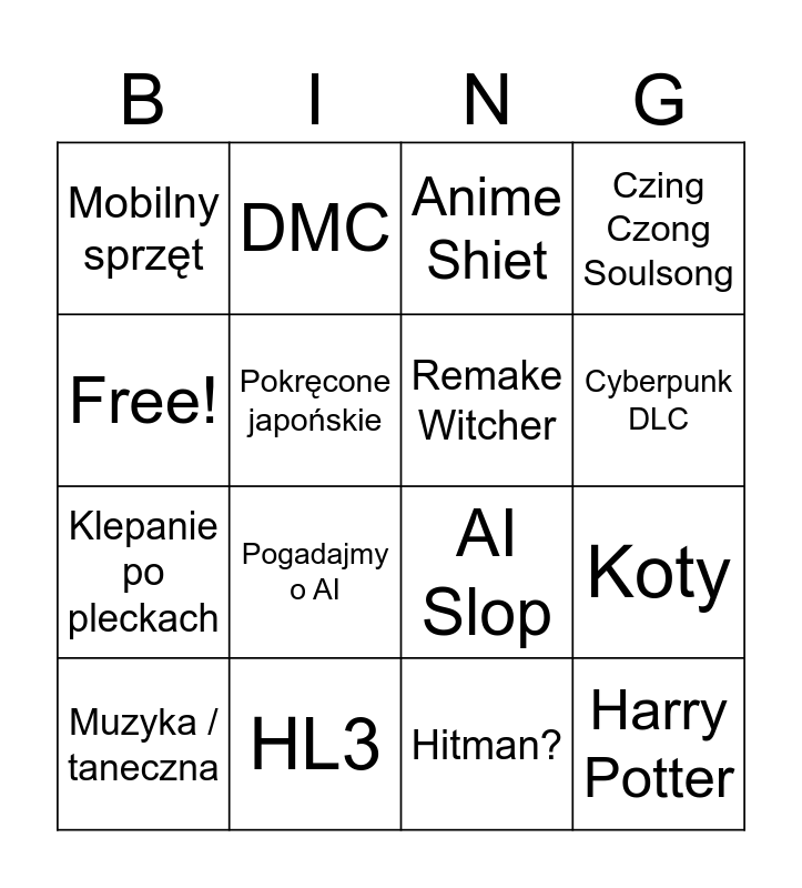 This bingo card has 16 words: HL3, Koty, Anime Shiet, Mobilny sprzęt, Klepanie po pleckach, DMC, AI Slop, Hitman?, Free!, Pokręcone japońskie, Muzyka / taneczna, Czing Czong Soulsong, Pogadajmy o AI, Cyberpunk DLC, Remake Witcher and Harry Potter.