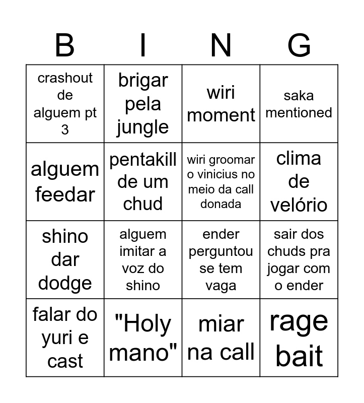 This bingo card has 16 words: falar do yuri e cast, "Holy mano", wiri moment, saka mentioned, alguem feedar, brigar pela jungle, ender perguntou se tem vaga, sair dos chuds pra jogar com o ender, crashout de alguem pt 3, pentakill de um chud, miar na call, clima de velório, shino dar dodge, alguem imitar a voz do shino, wiri groomar o vinicius no meio da call donada and rage bait.