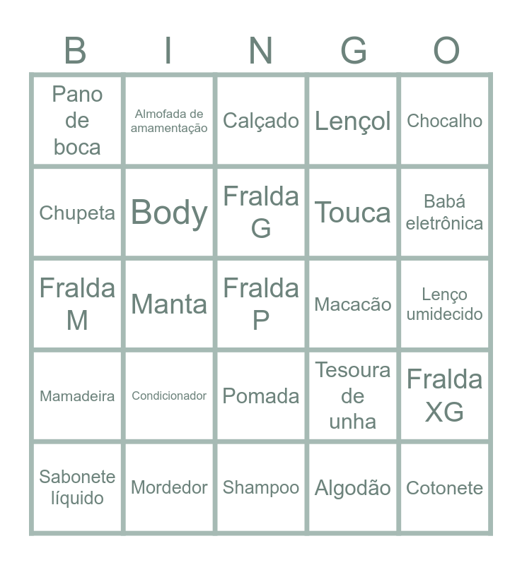 This bingo card has 35 words: Aspirador nasal, Sabonete em barra, Termômetro, Body, Pomada, Lençol, Chupeta, Canguru, Fralda G, Meias, Fralda M, Chocalho, Escova de cabelo, Toalha de banho, Pano de boca, Macacão, Algodão, Manta, Mamadeira, Fralda P, Tesoura de unha, Sabonete líquido, Fralda XG, Mordedor, Calçado, Babá eletrônica, Cotonete, Cueiro, Touca, Lenço umidecido, Babador, Shampoo, Condicionador, Almofada de amamentação and Andador.