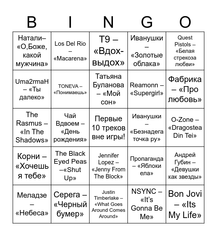 This bingo card has a free space and 25 words: The Black Eyed Peas –«Shut Up», Justin Timberlake – «What Goes Around Comes Around», Татьяна Буланова – «Мой сон», Меладзе – «Небеса», Quest Pistols – «Белая стрекоза любви», Натали– «О,Боже, какой мужчина», Uma2rmaH – «Ты далеко», Los Del Rio – «Macarena», Иванушки – «Безнадега точка ру», Jennifer Lopez – «Jenny From The Block», Reamonn – «Supergirl», The Rasmus – «In The Shadows», Пропаганда – «Яблоки ела», Андрей Губин – «Девушки как звезды», TONEVA – «Понимаешь», Arash / Анна Семенович – «На моря», O-Zone – «Dragostea Din Tei», Т9 – «Вдох-выдох», Фабрика – «Про любовь», Чай Вдвоем – «День рождения», Bon Jovi – «Its My Life», Серега – «Черный бумер», Корни – «Хочешь я тебе», Иванушки – «Золотые облака» and NSYNC – «It’s Gonna Be Me».