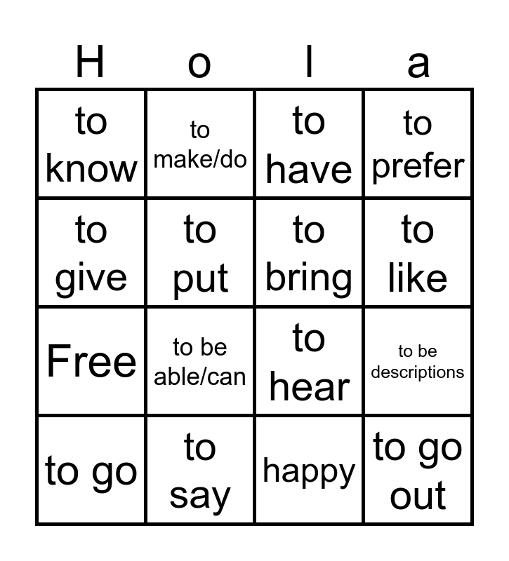 This bingo card has 20 words: to be descriptions, to be location/feeling, to have, to want, to go, to give, to say, to know, Free, to make/do, to be able/can, to hear, to put, to go out, to bring, to come, to like, to prefer, happy and sad.