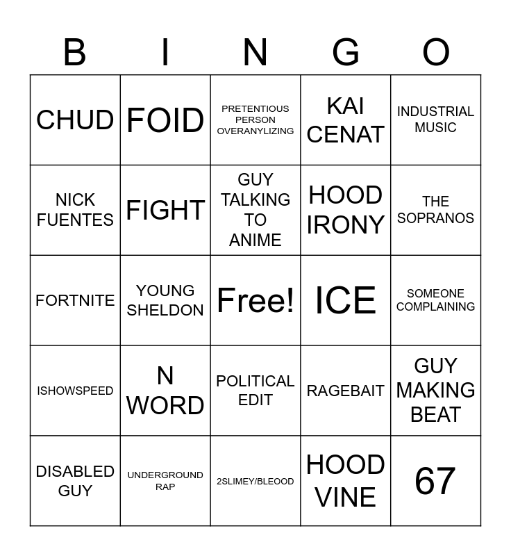 This bingo card has a free space and 24 words: N WORD, UNDERGROUND RAP, GUY TALKING TO ANIME, DISABLED GUY, INDUSTRIAL MUSIC, CHUD, NICK FUENTES, FOID, ICE, POLITICAL EDIT, HOOD IRONY, FORTNITE, RAGEBAIT, GUY MAKING BEAT, FIGHT, HOOD VINE, SOMEONE COMPLAINING, PRETENTIOUS PERSON OVERANYLIZING, THE SOPRANOS, YOUNG SHELDON, 67, ISHOWSPEED, KAI CENAT and 2SLIMEY/BLEOOD.