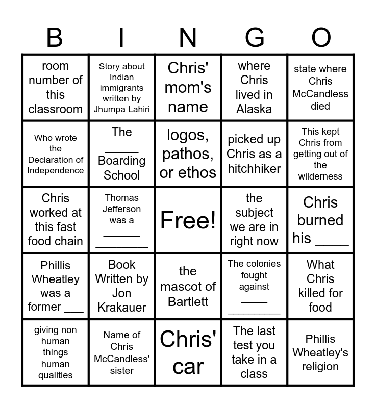 This bingo card has a free space and 24 words: Book Written by Jon Krakauer, Name of Chris McCandless' sister, logos, pathos, or ethos, giving non human things human qualities, state where Chris McCandless died, room number of this classroom, Who wrote the Declaration of Independence, Story about Indian immigrants written by Jhumpa Lahiri, the subject we are in right now, the mascot of Bartlett, picked up Chris as a hitchhiker, Chris worked at this fast food chain, The colonies fought against _____ __________, What Chris killed for food, The _____ Boarding School, The last test you take in a class, Chris burned his ____, Chris' mom's name, This kept Chris from getting out of the wilderness, Thomas Jefferson was a _______ __________, Phillis Wheatley's religion, Phillis Wheatley was a former ___, where Chris lived in Alaska and Chris' car.