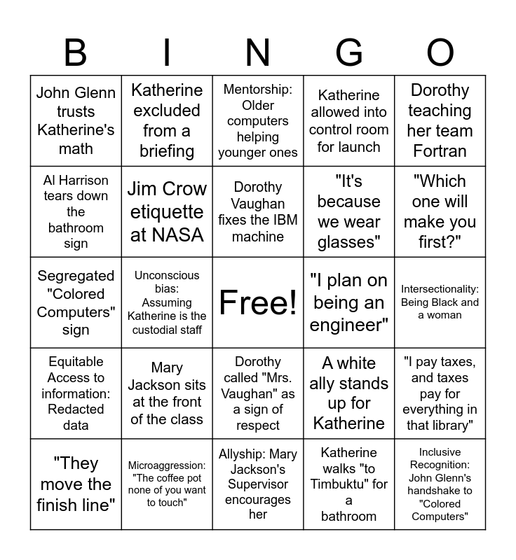 This bingo card has a free space and 24 words: Mary Jackson sits at the front of the class, Microaggression: "The coffee pot none of you want to touch", Dorothy Vaughan fixes the IBM machine, "They move the finish line", Dorothy teaching her team Fortran, John Glenn trusts Katherine's math, Al Harrison tears down the bathroom sign, Katherine excluded from a briefing, "I plan on being an engineer", Dorothy called "Mrs. Vaughan" as a sign of respect, "It's because we wear glasses", Segregated "Colored Computers" sign, A white ally stands up for Katherine, "I pay taxes, and taxes pay for everything in that library", Jim Crow etiquette at NASA, Katherine walks "to Timbuktu" for a bathroom, Intersectionality: Being Black and a woman, Mentorship: Older computers helping younger ones, "Which one will make you first?", Unconscious bias: Assuming Katherine is the custodial staff, Inclusive Recognition: John Glenn's handshake to "Colored Computers", Equitable Access to information: Redacted data, Katherine allowed into control room for launch and Allyship: Mary Jackson's Supervisor encourages her.