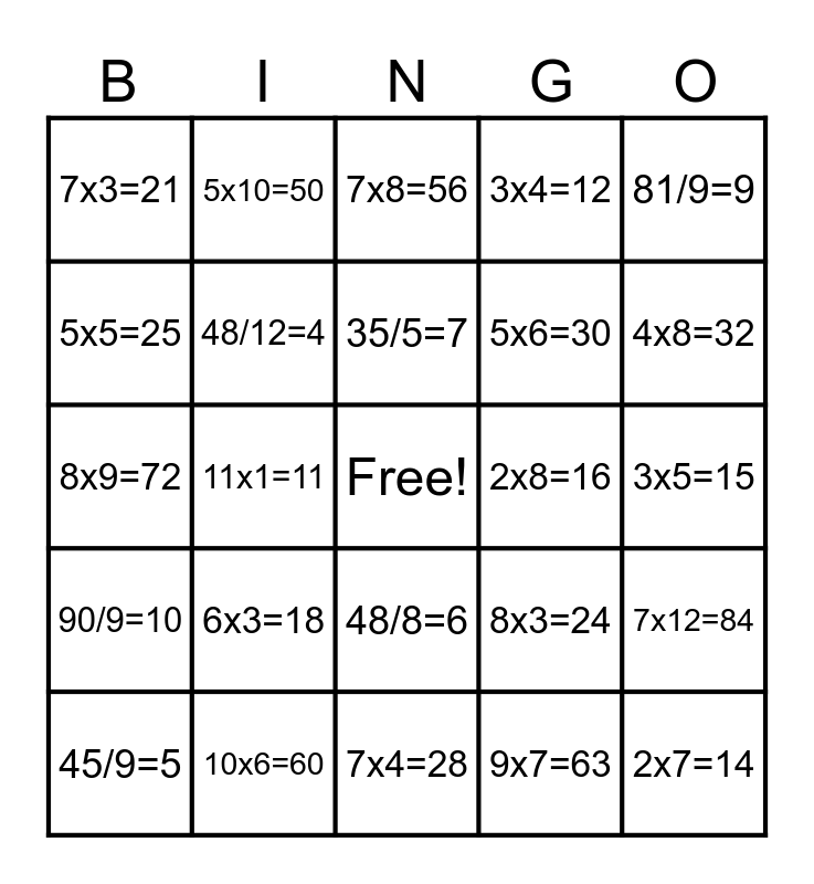 This bingo card has a free space and 39 words: using these equations make 30 different bingo cards decorated with yellow and blue "Sunnydale AAAC Math Bingo" 7/7=1, 20/10=2, 27/9=3, 48/12=4, 45/9=5, 48/8=6, 35/5=7, 64/8=8, 81/9=9, 90/9=10, 11x1=11, 3x4=12, 2x7=14, 3x5=15, 2x8=16, 6x3=18, 5x4=20, 7x3=21, 11x2=22, 8x3=24, 5x5=25, 7x4=28, 5x6=30, 4x8=32, 11x3=33, 9x4=36, 7x6=42, 11x4=44, 7x7=49, 5x10=50, 9x6=54, 11x5=55, 7x8=56, 10x6=60, 9x7=63, 11x6=66, 7x12=84, 8x9=72 and 11x7=77.