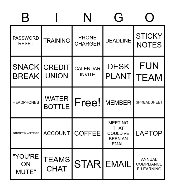 This bingo card has a free space and 26 words: COFFEE, EMAIL, CALENDAR INVITE, TEAMS CHAT, STICKY NOTES, PASSWORD RESET, SNACK BREAK, TRAINING, SPREADSHEET, MEETING THAT COULD'VE BEEN AN EMAIL, DESK PLANT, HEADPHONES, LAPTOP, "YOU'RE ON MUTE", WATER BOTTLE, BRAINSTORM, DEADLINE, INTRANET/SHARESPACE, PHONE CHARGER, ANNUAL COMPLIANCE E-LEARNING, FUN TEAM, STAR, MEMBER, ACCOUNT, CREDIT UNION and LOAN.