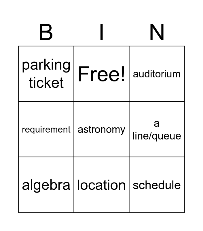 This bingo card has 12 words: sociology paper, schedule, astronomy, a line/queue, Free!, auditorium, location, seat, parking ticket, requirement, algebra and cheaper.