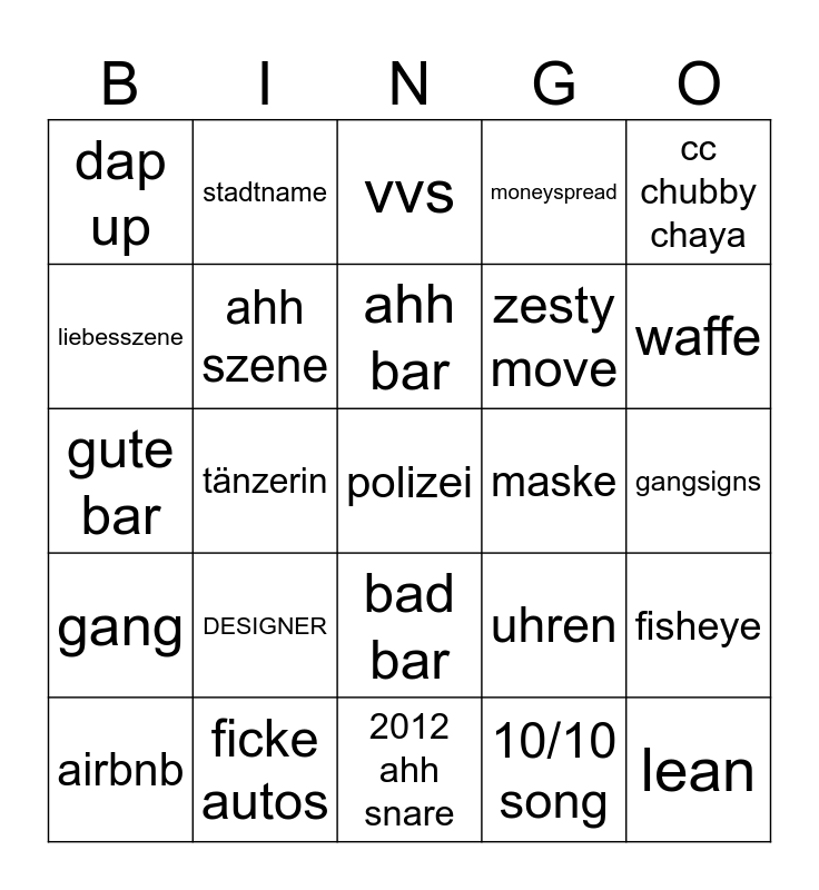 This bingo card has a free space and 24 words: DESIGNER, ficke autos, ahh bar, airbnb, cc chubby chaya, dap up, liebesszene, stadtname, maske, bad bar, zesty move, gute bar, uhren, fisheye, ahh szene, 10/10 song, gangsigns, vvs, waffe, tänzerin, lean, gang, moneyspread and 2012 ahh snare.