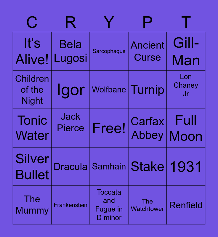 This bingo card has a free space and 24 words: Dracula, Frankenstein, Wolfbane, The Mummy, Gill-Man, It's Alive!, Children of the Night, Bela Lugosi, Carfax Abbey, Samhain, Turnip, Tonic Water, Stake, 1931, Igor, The Watchtower, Full Moon, Sarcophagus, Lon Chaney Jr, Jack Pierce, Renfield, Silver Bullet, Ancient Curse and Toccata and Fugue in D minor.