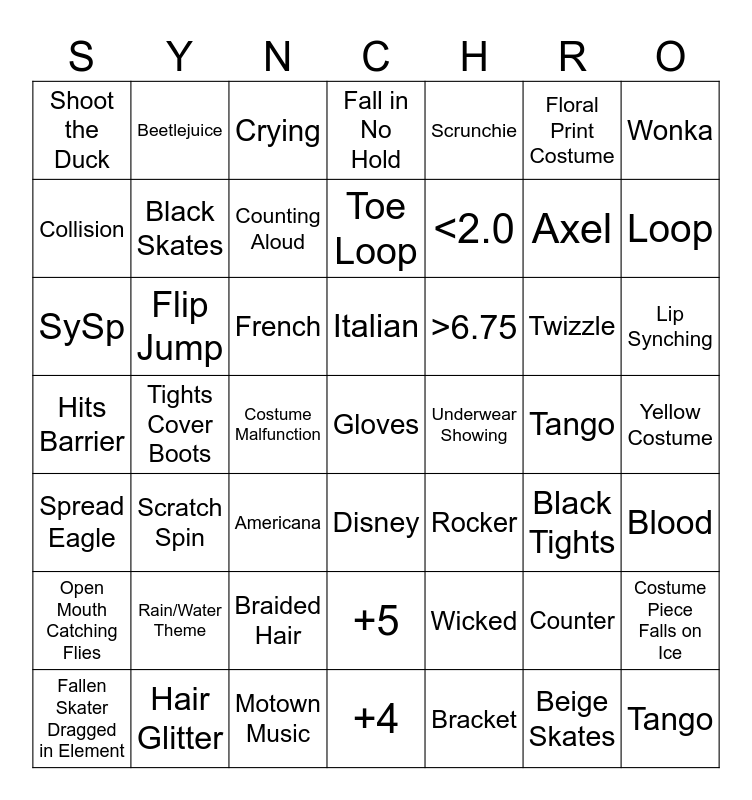 This bingo card has 56 words: Beige Skates, Lip Synching, Barf, Shoot the Duck, Tights Cover Boots, Braided Hair, Wonka, Newsies, Black Skates, +5, Fall in No Hold, Open Mouth Catching Flies, Spread Eagle, Yellow Costume, Hair Glitter, Scratch Spin, Scrunchie, <2.0, Tango, Axel, Loop, Americana, >6.75, Crying, White Skates, Collision, Tango, Splits, Counting Aloud, Disney, False Start, Blood, Fallen Skater Dragged in Element, Motown Music, SySp, Floral Print Costume, Toe Loop, Rain/Water Theme, Flip Jump, Beetlejuice, Italian, Gloves, Wicked, Bielman, Costume Piece Falls on Ice, French, Hits Barrier, +4, Black Tights, Underwear Showing, Costume Malfunction, Rocker, Counter, Bracket, Twizzle and Diamond / Pyramid Block.