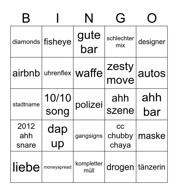 This bingo card has a free space and 24 words: dap up, moneyspread, waffe, liebe, designer, diamonds, airbnb, fisheye, ahh szene, gangsigns, zesty move, stadtname, cc chubby chaya, maske, uhrenflex, drogen, ahh bar, gute bar, autos, 10/10 song, tänzerin, 2012 ahh snare, schlechter mix and kompletter müll.